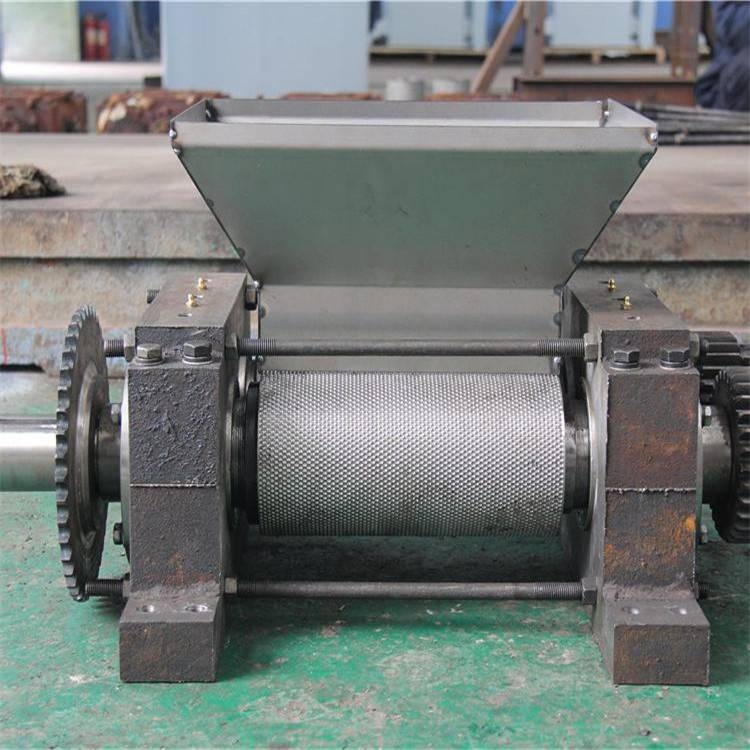 由電動機驅動皮帶和皮帶輪,通過減速機傳遞給主動軸,并通過對開式齒輪與被動軸同步,相向工作。物料從進料斗加入,經過輥擠壓成型,脫模造球,并經過一副鏈條,傳送到破碎篩工作室,篩下和分離成品顆(球)粒,然后返回料與新料混合,再進行造粒。隨著電動機連續(xù)轉動,物料的不斷進入,方能實現批量生產。